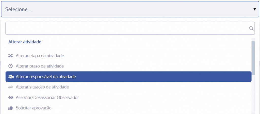 Clique em Selecione e escolha o tipo de ação Alterar responsável da atividade